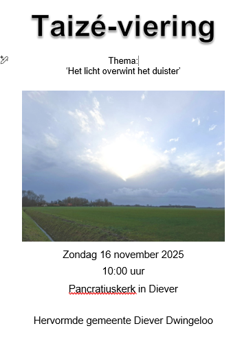 Zondag 16 november 2025 om 10:00 uurTaizé viering, georganiseerd door eigen gemeenteleden, Pancratiuskerk in DieverVoorganger(s): Werkgroep Bezinning en Inspiratie Organist: Andries Kamphof |